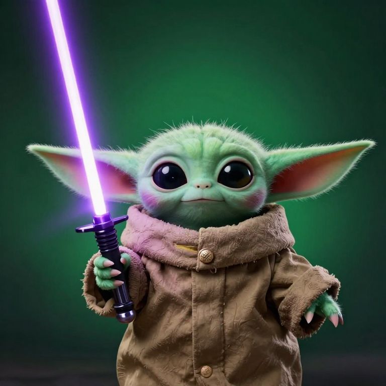 The image depicts a cute, green, furry creature with large, expressive eyes, reminiscent of Baby Yoda from the Star Wars universe. The character is adorned in a brown robe with a belt and a small, glowing object attached to it, suggesting a mystical or Jedi-like origin. The background is a gradient of dark green to black, with a purple light saber-like beam emanating from the top left corner, adding a sense of mystery and power. The overall composition is balanced, with the character centrally positioned and the glowing beam creating a focal point that draws the viewer's eye. The texture of the robe and the fur on the character's head add depth and realism to the image, while the vibrant colors and soft lighting create a warm and inviting atmosphere.