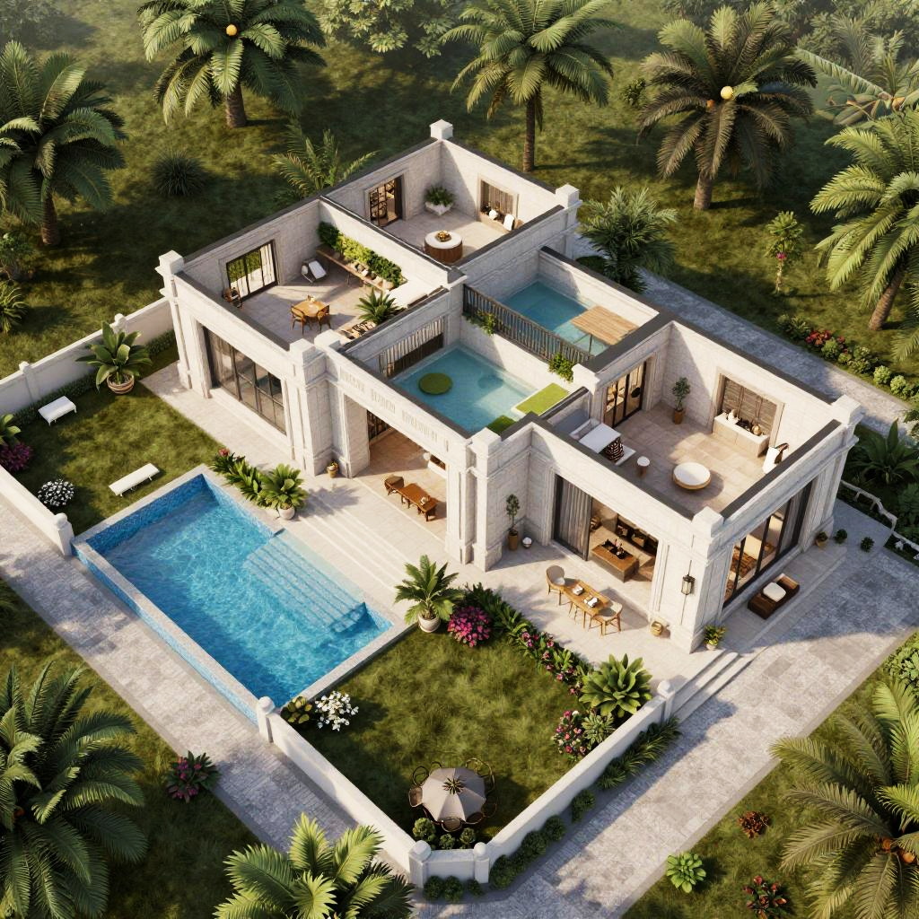 Floor plan creator ai visualizing a luxury villa floor plan with open terraces, swimming pool, landscaped garden areas, and multiple guest rooms, presented in photorealistic 3D render style with dynamic daylight simulation and high architectural fidelity