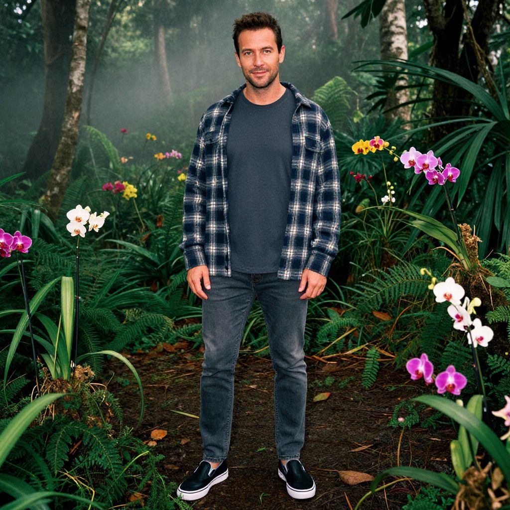 A man, dark grey longline tee, charcoal skinny jeans, sleek black slip-on sneakers, oversized plaid flannel shirt, modern casual, dense tropical rainforest, vibrant orchids blooming, mist rising from the forest floor, technicolor analog film stock, relaxed smile, confident gaze.Man has masculine face and piercing eyes