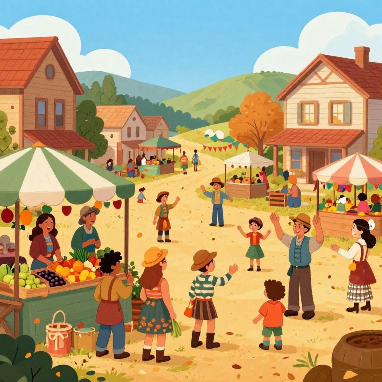 Bonanza harvest festival in a quaint rural village, colorful market stalls laden with fruits and vegetables, happy villagers celebrating, autumn leaves falling, warm and inviting mood, detailed character expressions, festive decorations under a bright blue sky