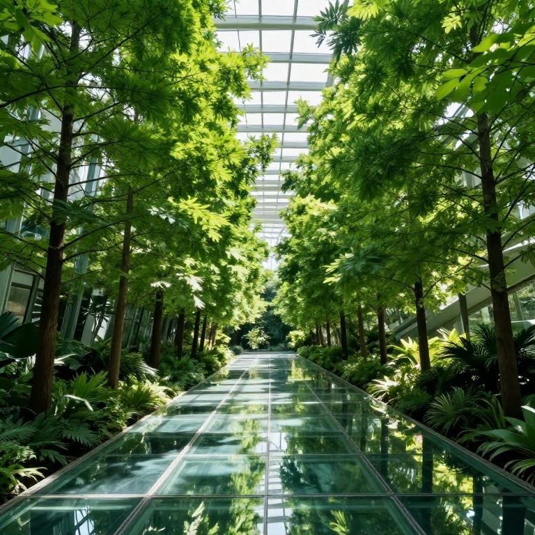 Photograph of a modern indoor atrium with a glass ceiling allowing bright sunlight to filter through lush green trees. The floor is made of reflective glass panels, mirroring the trees and light. Ferns and other green plants line both sides of the path, adding to the verdant atmosphere. The space is framed by tall glass walls on either side, enhancing the natural light. The overall scene is bright, fresh, and tranquil, with a harmonious blend of natural and architectural elements.