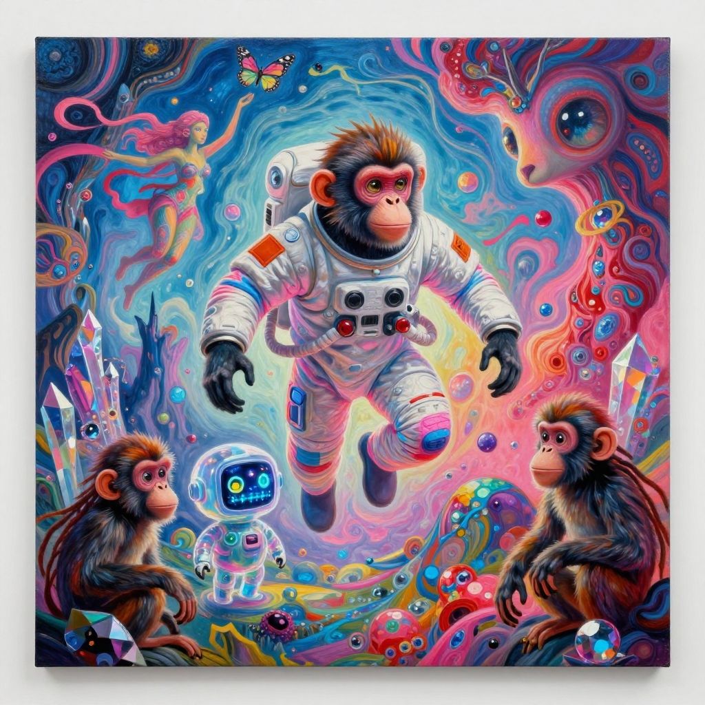 This vibrant digital illustration features a central anthropomorphic monkey in a white astronaut suit with red stripes, floating in a swirling, colorful space-like environment. Surrounding the monkey are three smaller monkeys, one with a robotic head, and various whimsical elements like butterflies, bubbles, and crystals. The background bursts with blue, pink, and purple hues, creating a surreal, psychedelic effect. The astronaut monkey has a serious expression, while the smaller monkeys and the robotic one look curious. The overall style is highly detailed and fantastical, blending elements of science fiction and surrealism.