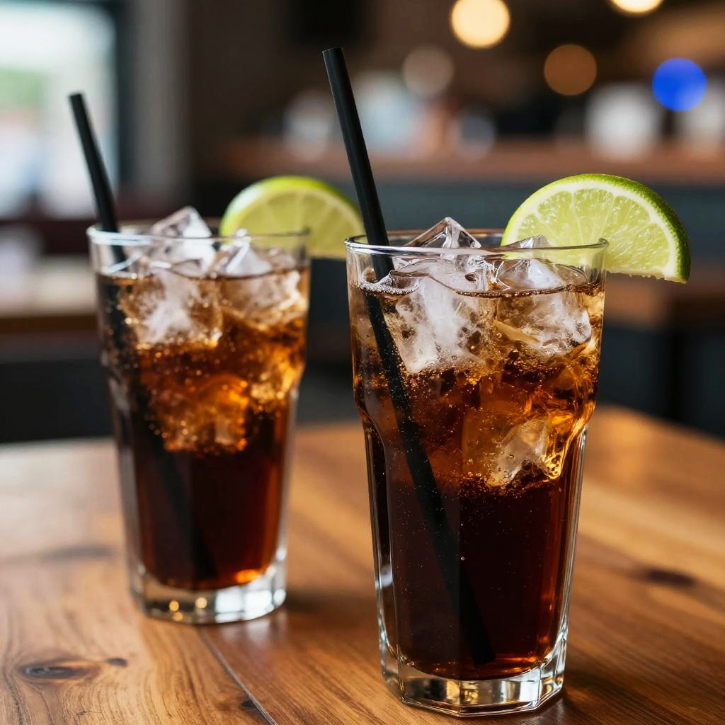Photograph of two tall glasses on a wooden bar counter, each filled with ice cubes, dark soda, slices of orange and lime, and a black straw. The background is a blurry array of colorful, illuminated liquor bottles, creating a warm, inviting ambiance. The glasses are slightly out of focus, emphasizing the chilled, refreshing drinks inside.