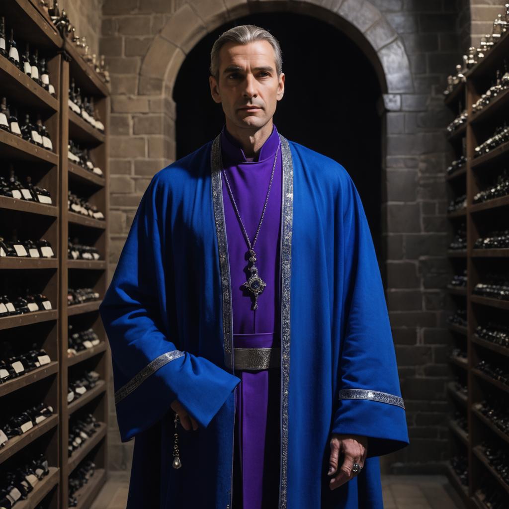 Photo of a Tall man, Temple Fade, priest outfit, wearing a Cobalt robe made of Cashmere with a silver accessory, wine cellar gathering, drama and contrast