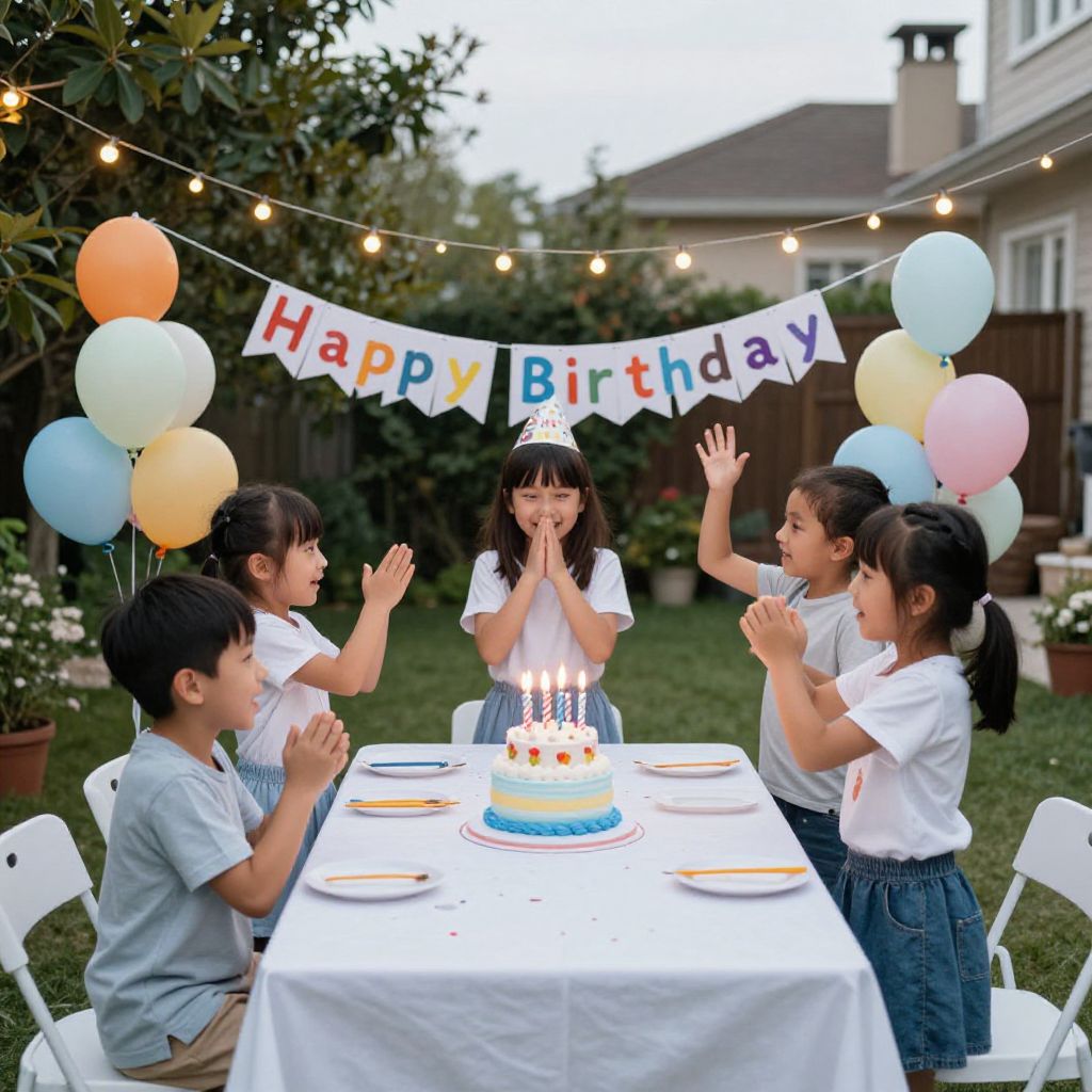 Feliz cumplea scene showing a festive birthday party outdoors, kids wearing party hats and blowing out candles on a large cake, streamers and decorations in the background, warm sunlight and happy expressions everywhere.
