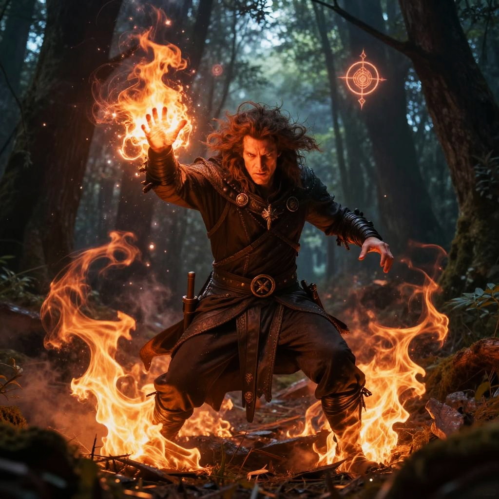 Krankus, a powerful sorcerer casting a fiery spell in a dark enchanted forest, swirling magical energies around him, intense gaze, dramatic shadows, mystical glowing symbols, fantasy art style with rich color palette
