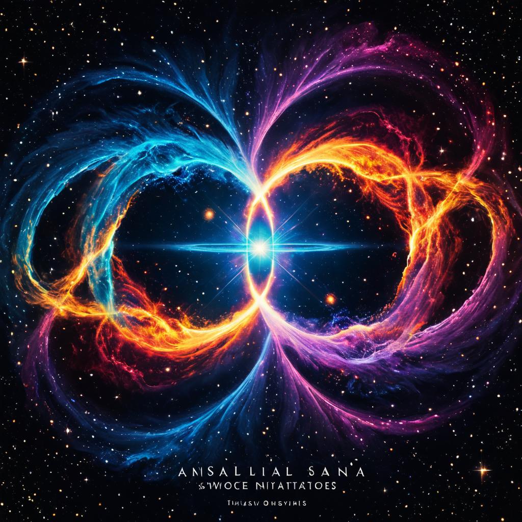 Fictional artwork logo for Space Exploration Initiatives, portraying a celestial scene of two nebulae intertwining in a cosmic dance of vibrant colors and swirling gases. The celestial bodies appear to embrace, emanating an otherworldly glow, capturing the beauty and mystery of the cosmos; ethereal and enchanting depiction in the background