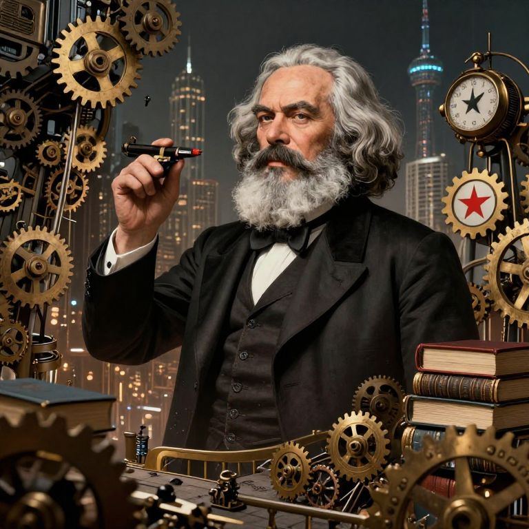 Marx's philosophy depicted as a dynamic and intricate steampunk city, filled with cogwheels, books, and revolutionary symbols, dramatic lighting highlighting historical and futuristic elements, blending realism and surrealism.