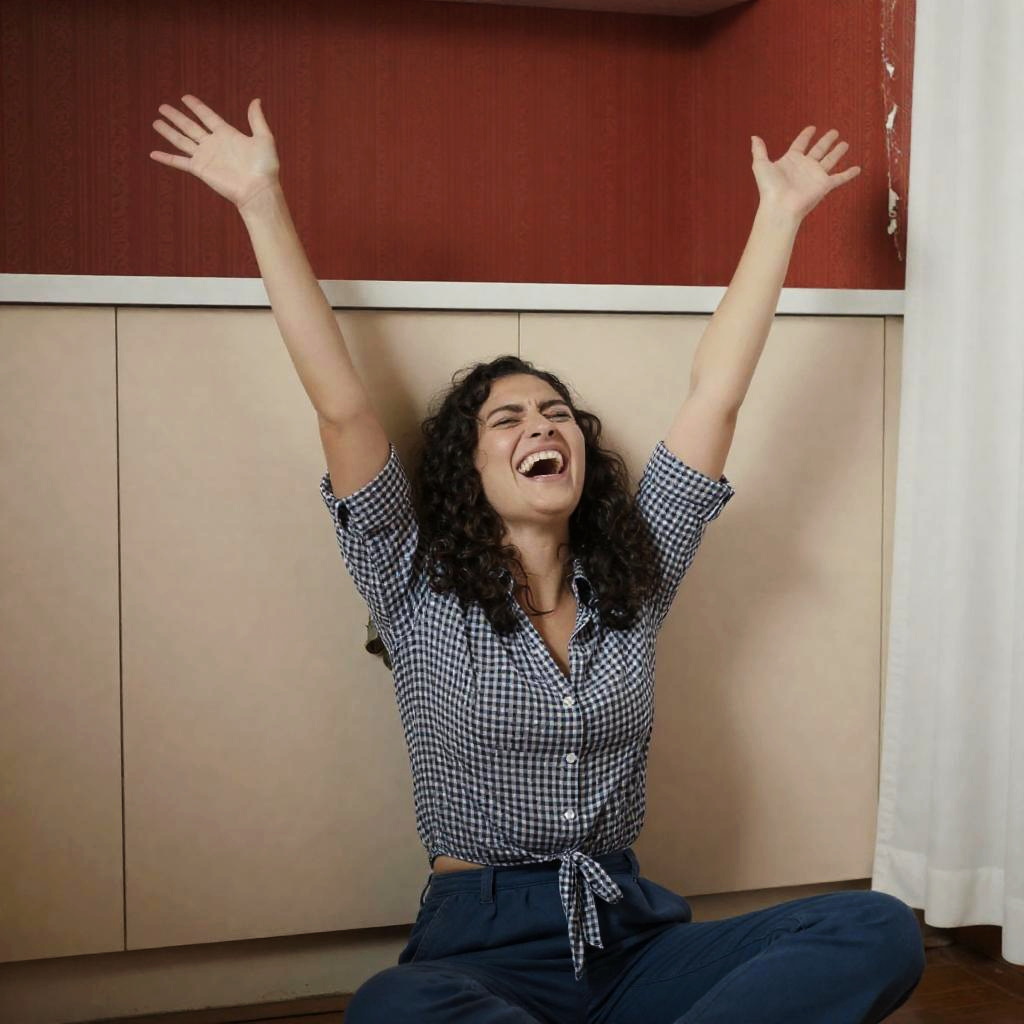 Woman with dark curly hair, wearing checkered shirt and blue pants, sitting on floor, arms raised, laughing, against beige cabinet. Red patterned wallpaper, worn edges, white curtain to the right. Background includes patterned red wallpaper and beige cabinetry.