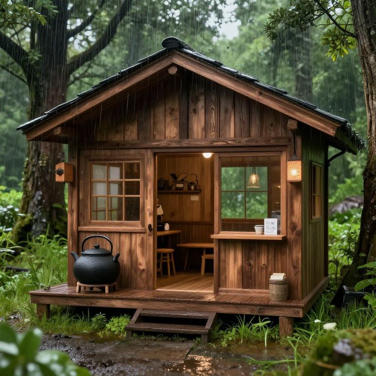 Rick Grimes park in the rain, wooden cabin, pot, Japanese, tree, inside coffee shop, green, landscape, ultra detail, photorealistic, 3d, details 4k,
