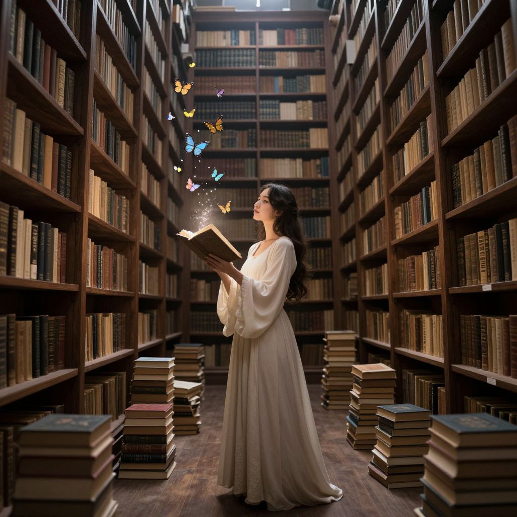 In a hushed library bathed in ethereal light, a woman in a flowing gown holds an open tome as delicate butterflies drift through the air, weaving between towering shelves of ancient wisdom and stacks of books that seem to defy gravity, creating a surreal bridge between the mundane and the magical.