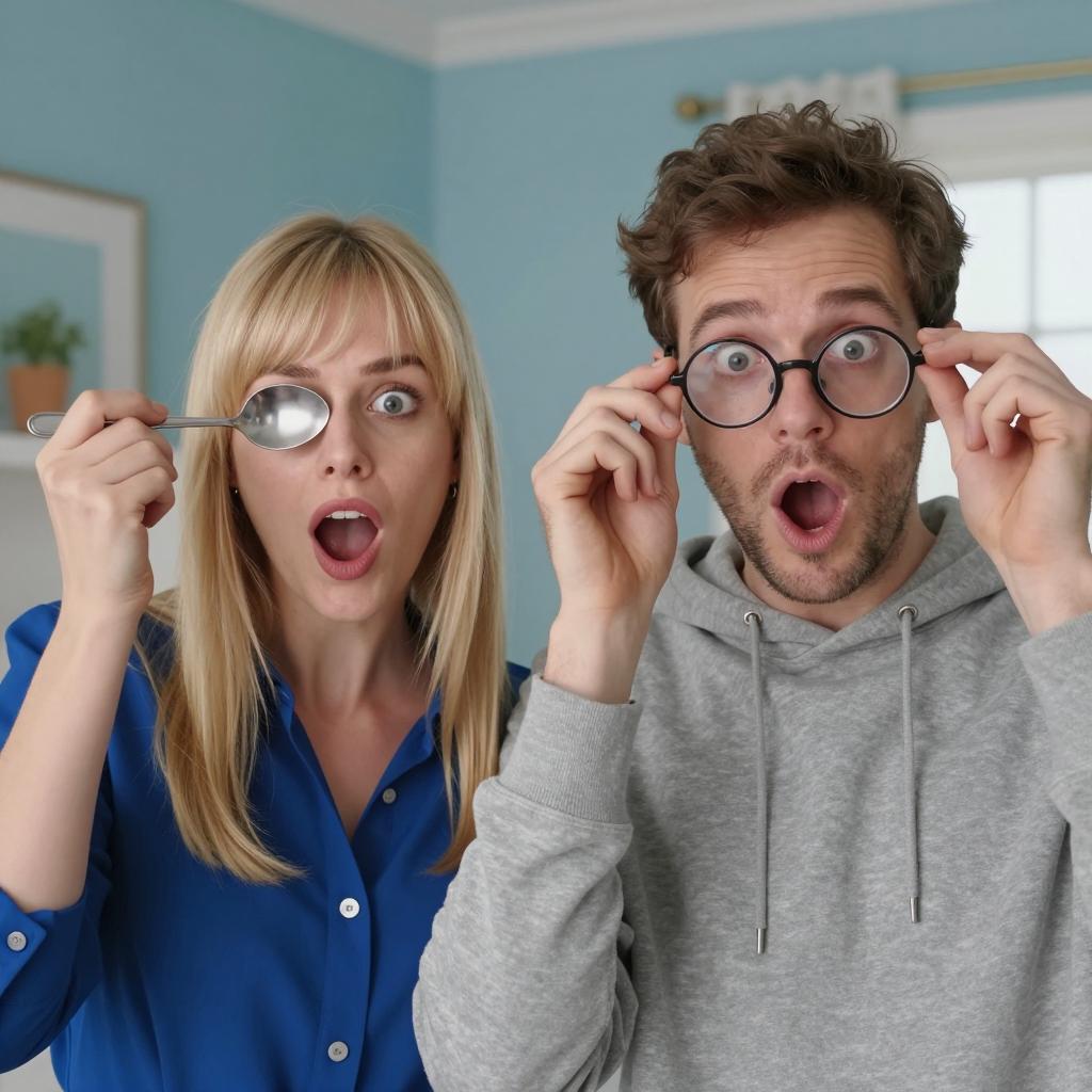 Two people in a close-up photograph. The person in front has dark hair, wears yellow-rimmed glasses, and holds a magnifying glass to his face, with an open-mouthed surprised expression. The person behind has blonde hair, looks over the shoulder, and holds a spoon close to the magnifying glass. Both wear gray hoodies. The background is blurred, with a dark blue ceiling and light coming from the left.