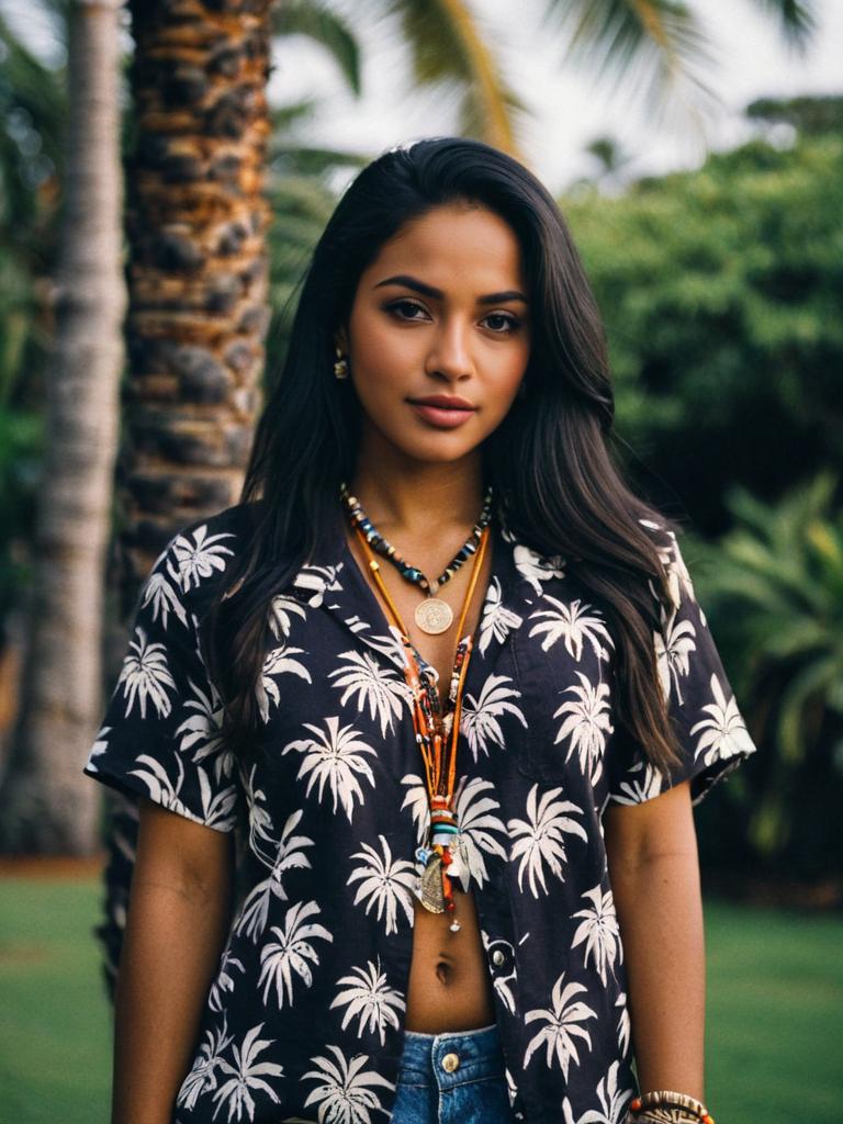 Portrait of a dark-skinned woman with long black hair wearing a black Hawaiian shirt with white palm tree prints. She is accessorized with layered necklaces and bracelets, standing outdoors with palm trees and greenery in the blurred background. The woman is looking directly at the camera with a confident expression.