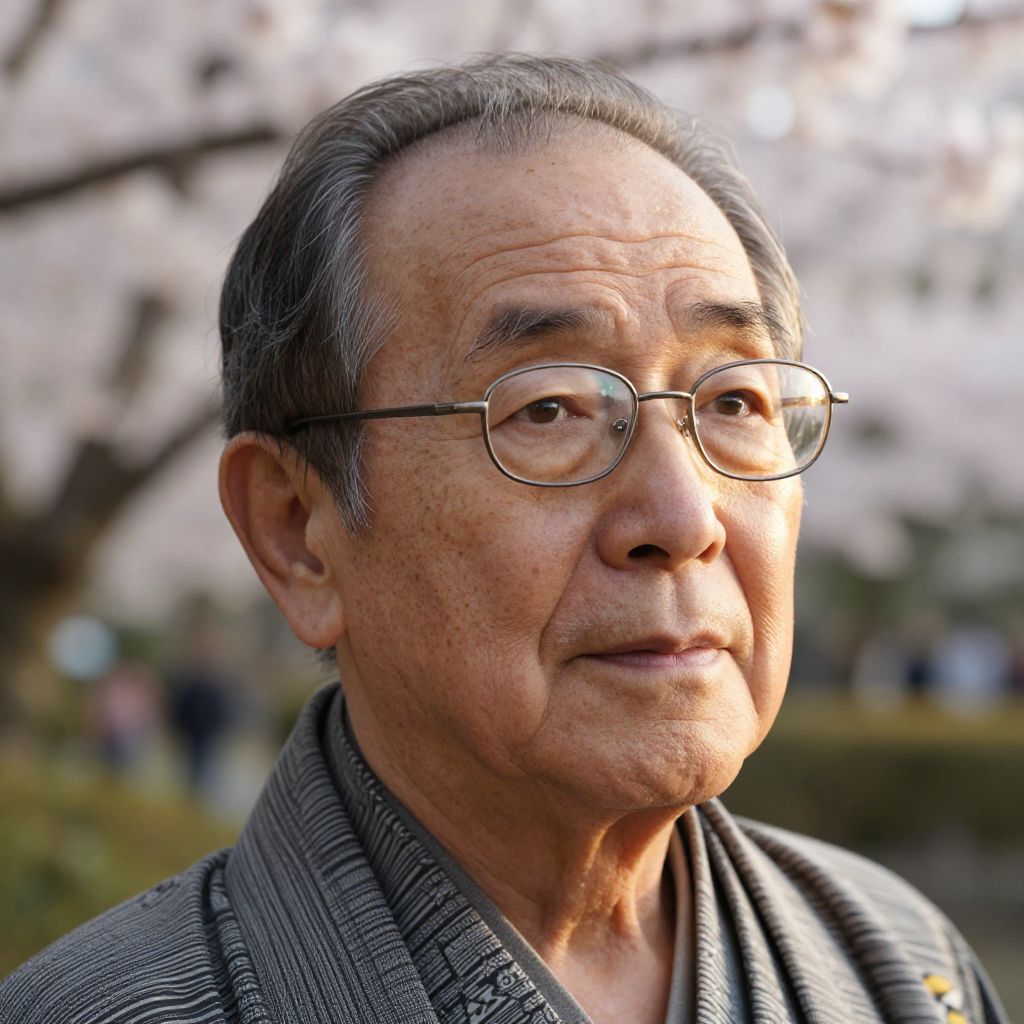 Craft a hyperrealistic portrait showcasing an elderly Japanese man with a vintage face adorned by deep lines and subtle freckles, captured in close-up view. His traditional Japanese attire, featuring intricate patterns, frames his thoughtful gaze from beneath heavy eyebrows. Employ side lighting to accentuate the interplay of light and shadow across his visage while a soft golden glow emanates behind him, casting gentle reflections on his glasses and infusing warmth into his serene expression. The backdrop, a blurred yet detailed garden scene with cherry blossom trees in full bloom, evokes feelings of reflection, nostalgia, and peacefulness through this enchanting portrait's emotional gradient.