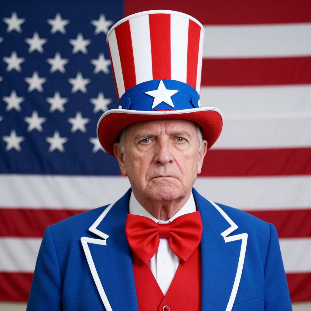 A photograph of an older white man with a serious expression, wearing a blue jacket with white trim, a red vest, and a large red bow tie. He's also sporting a tall, red and white striped top hat with a blue band and a white star. The backdrop is a large American flag, with red and white stripes and white stars on a blue field. The colors are vibrant and the flag is slightly blurred in the background.