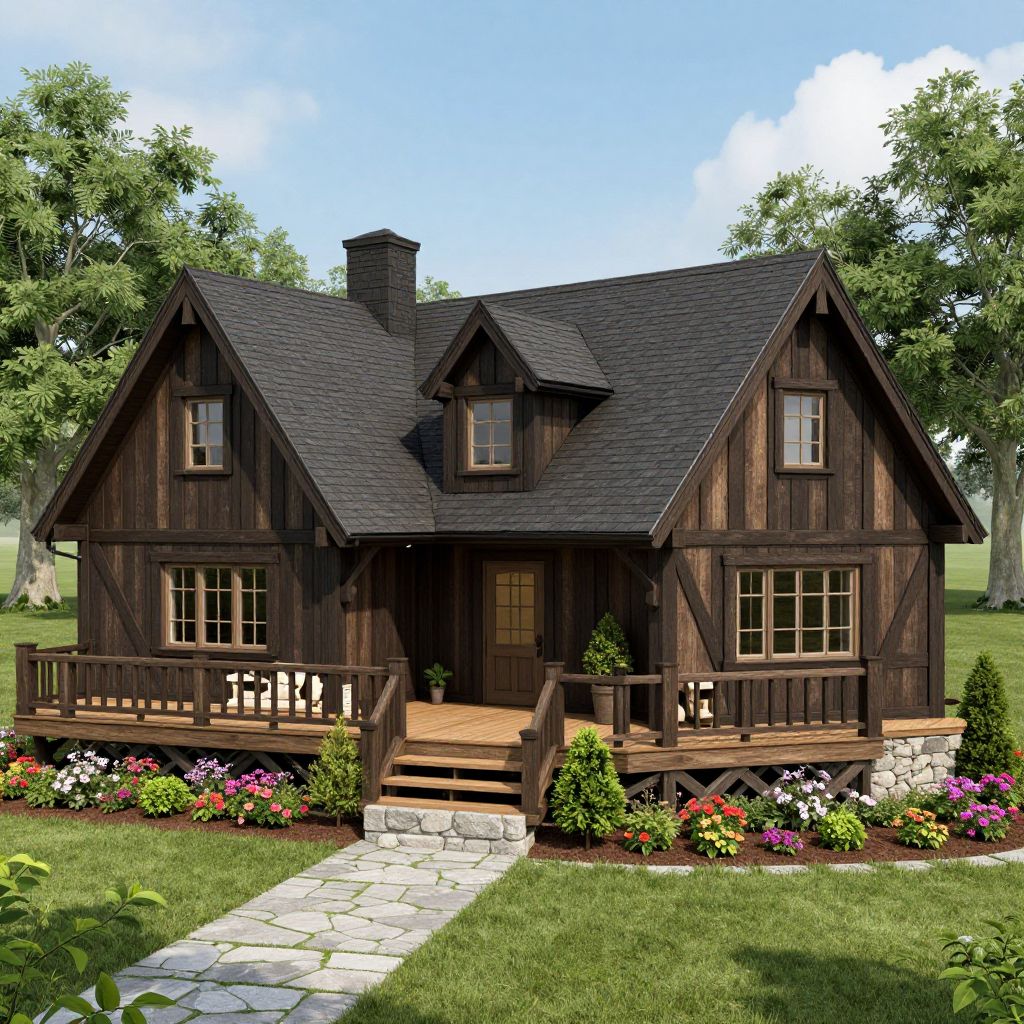 Rustic log cabin with a charming porch and three windows stands gracefully in a serene forest setting, showcasing handcrafted wooden details and a cozy, inviting design by Ruman Twist.