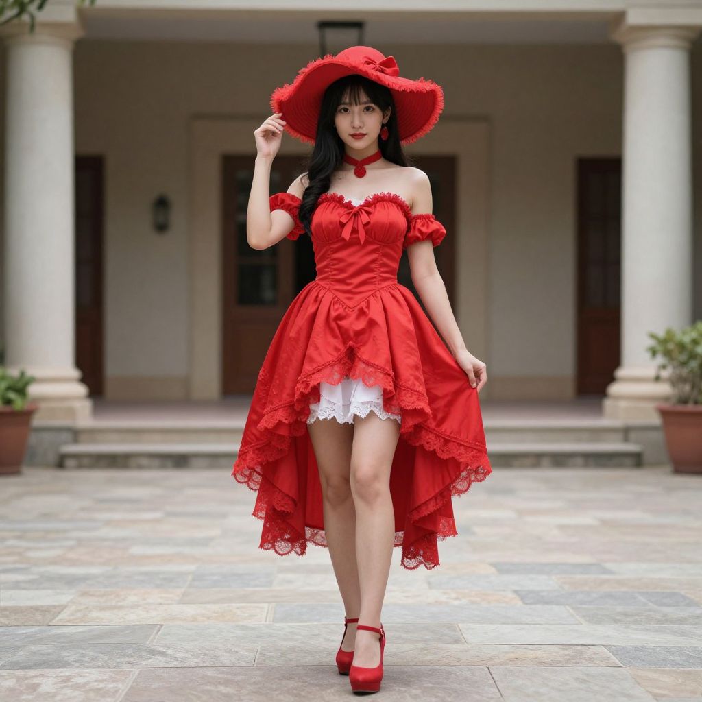 Photograph of an Asian woman with long black hair and fair skin, wearing a vibrant red, off-shoulder, lace-trimmed dress with a white lace hem and red bow at the chest. She also wears a wide-brimmed red hat adorned with a flower, red choker, and red high heels. She stands confidently in a courtyard with stone tiles, white columns, and potted plants in the background. The building behind her has beige walls and dark wooden doors. The woman's outfit and accessories create a striking, vintage-inspired look.