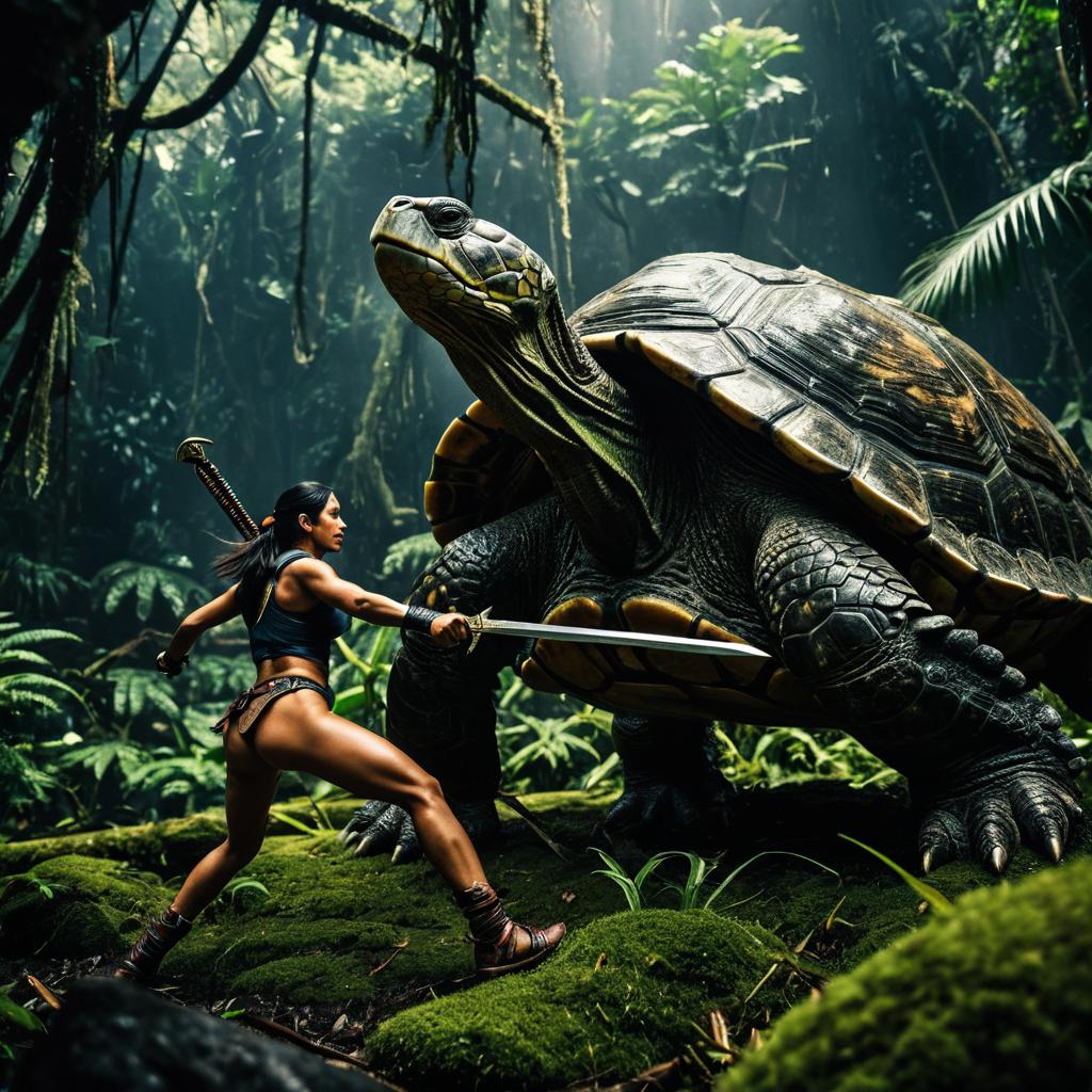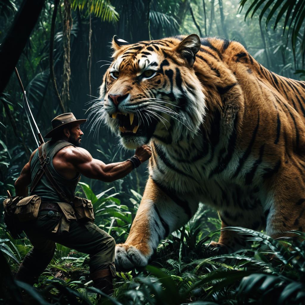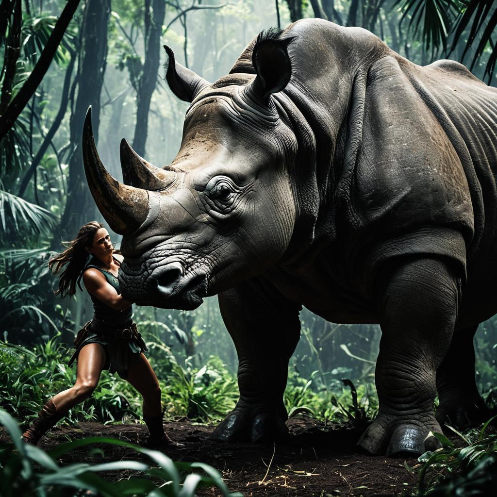 Hyper-realistic image of a muscular woman dressed in minimal athletic gear facing a massive rhinoceros in a dense, misty jungle. The scene captures an intense, dramatic confrontation with detailed textures of the rhino's skin and the woman's defined musculature. Lush green foliage surrounds them, enhancing the dark, chiaroscuro lighting and cinematic atmosphere.