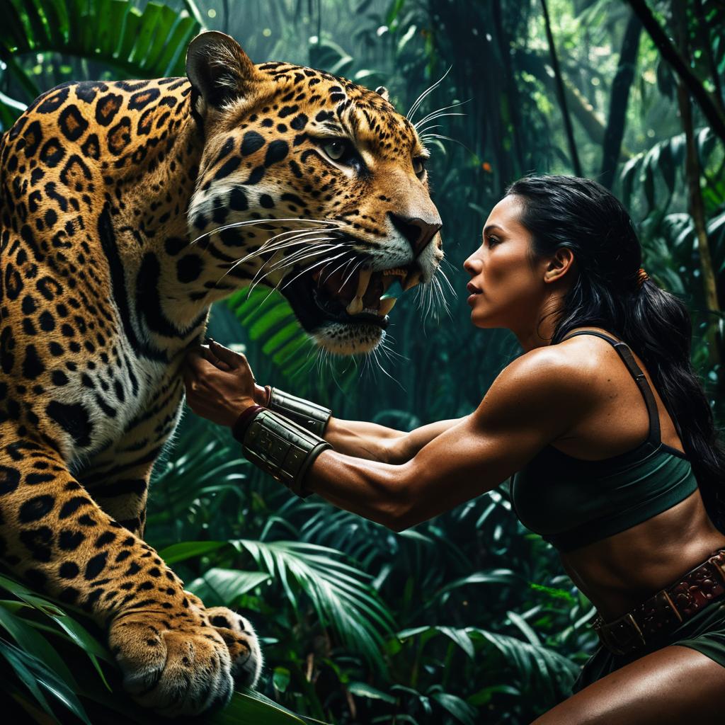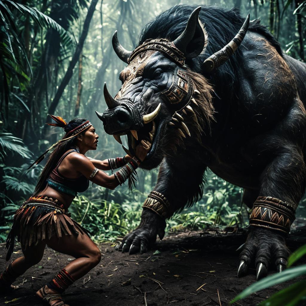 Very dark focused flash photo, amazing quality, masterpiece, best quality, hyper detailed, ultra detailed, UHD, perfect anatomy, portrait, dof, hyper-realism, majestic, awesome, inspiring. Capture the thrilling showdown between the beautiful female Forest guardian and the colossal jungle boss Thunderous rhino in an epic battle amidst the jungle. Embrace the action and chaos as these formidable forces clash. Cinematic composition, soft shadows, national geographic style, extremely detailed, dark, chiaroscuro, low-key, Bosstyle.
