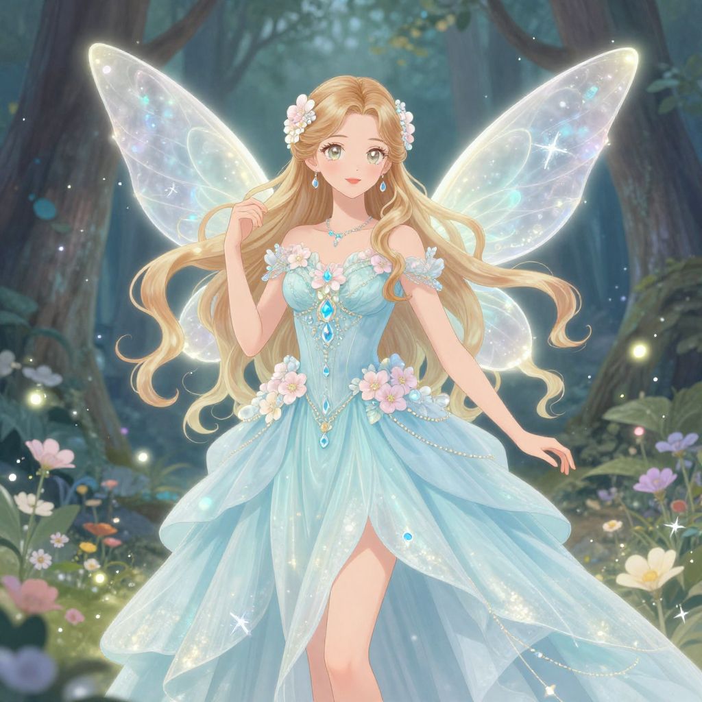 Digital illustration of an elegant young woman with long flowing blonde hair, adorned with a large decorative hat featuring blue and gold flowers. She is dressed in a blue and gold embroidered gown with floral designs and matching jewelry set against a glowing blue and starry background.