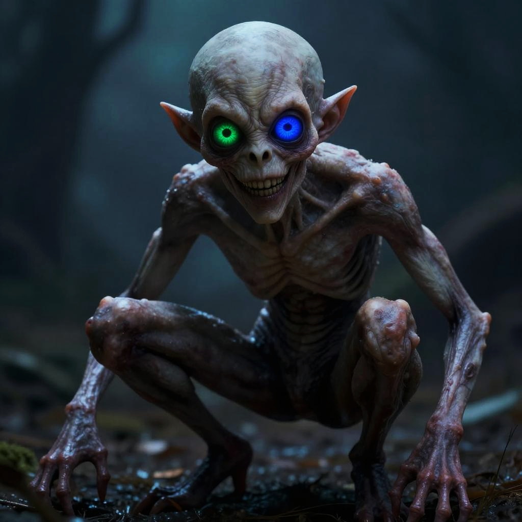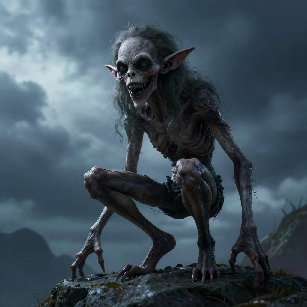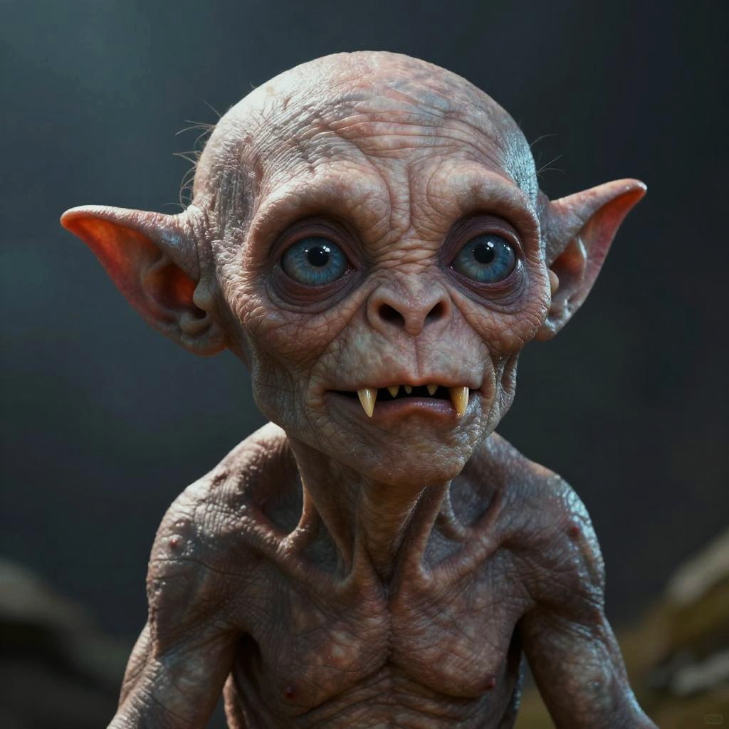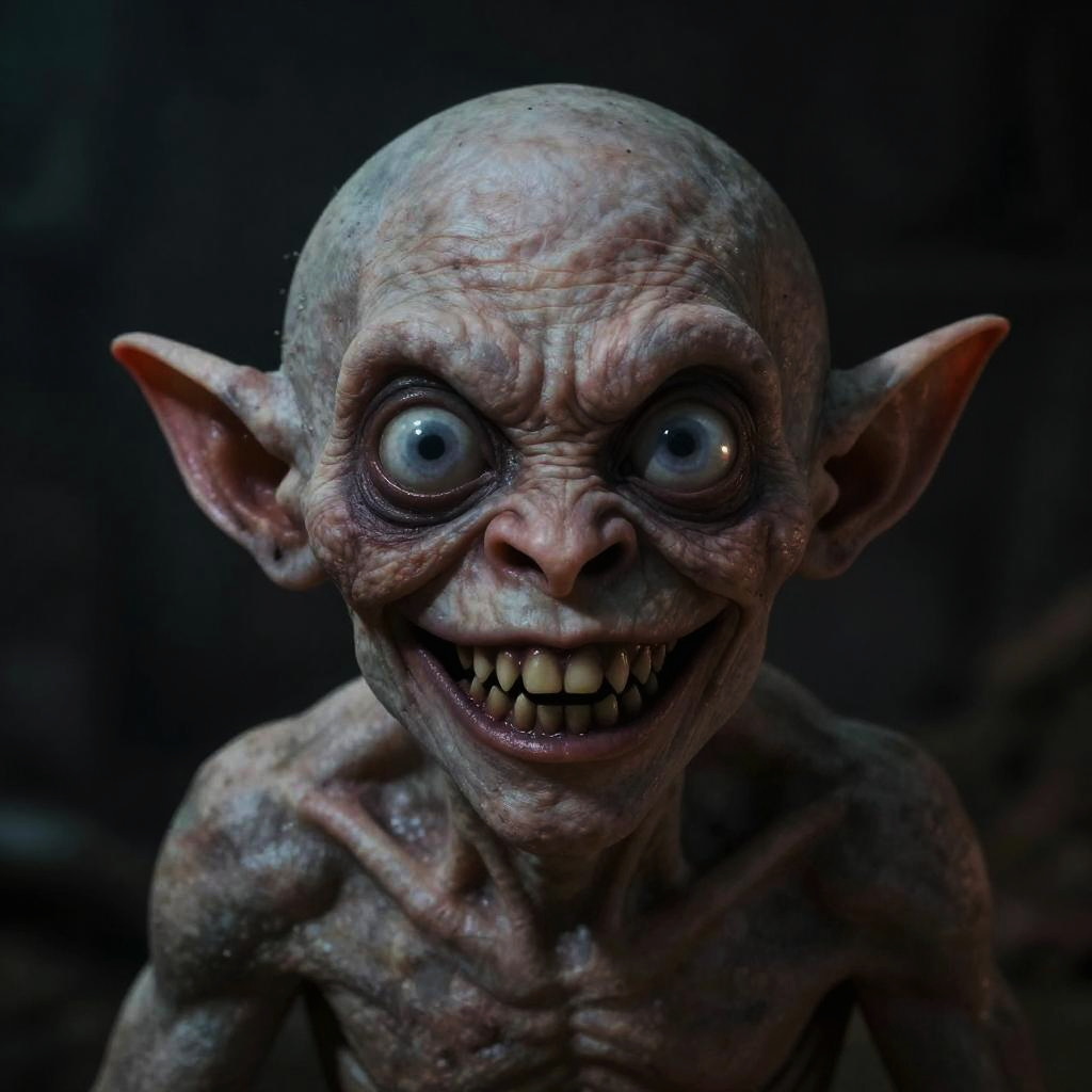 A CGI image of a creepy, bald, pale-skinned zombie-like figure with blue eyes and a wide, crazed grin. It's raising its left hand, showing a gold ring on its middle finger. The zombie's skin is wrinkled and dirty, with dark smudges. Its eyes are wide and wild, giving it a frantic appearance. The background is a plain white, making the figure the focal point.