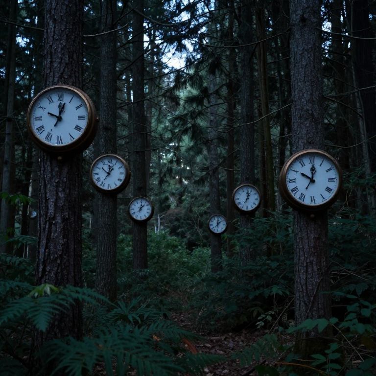 A forest of whispering clocks grows in perpetual twilight, where the trees tick only when unobserved.