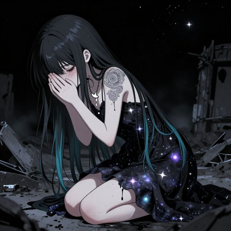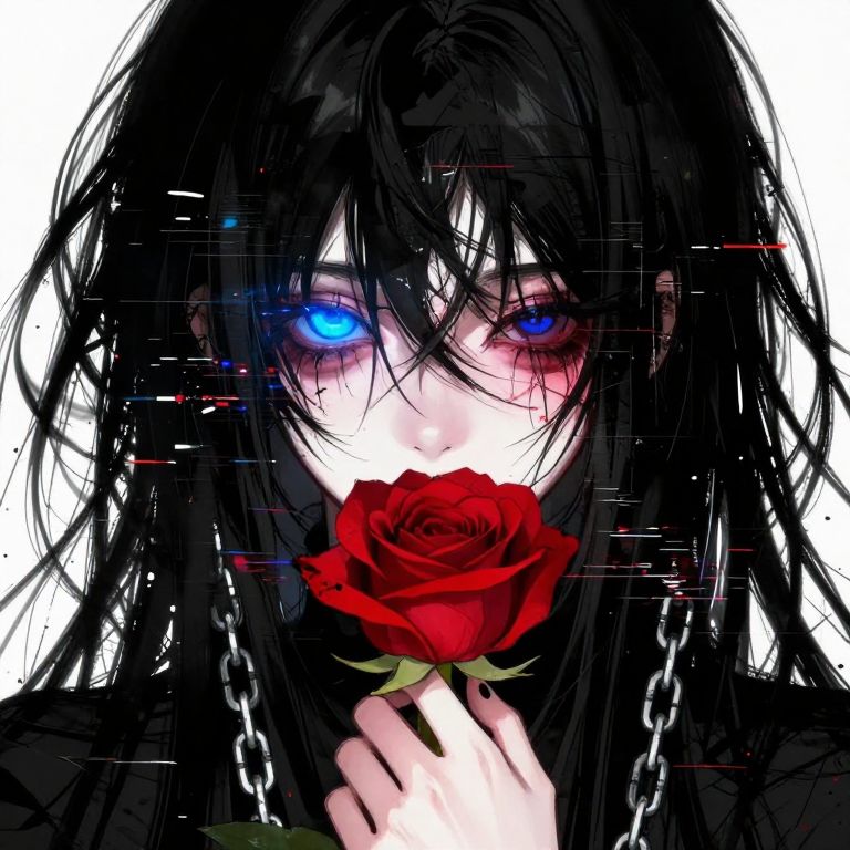 Weibo, drawing, illustration retro 90's, yoji shinkawa, James Jean, Ayami Kojima, chromatic aberration, detail, high contrast, cinematic view, volumetric lighting, perspective, messyhair, grittytexture, melancholicmood, cinematic, whitehair, voluminousbangs, eyescovered, milkwhiteskin, redcrossearring, whitecroptop, ethereal, minimalistic, softlight, mysteriousexpression, serene, intensedetail, photorealistic, sharp focus, A stylized character with a striking sexuality appearance, A close-up of a character a humanoid raven with long, wavy black hair, styled with thick, voluminous bangs that fully cover her eyes, She wears a loose, semi-transparent white crop top, Her accessories include a large red cross earring, adding a subtle contrast to her delicate look, Her sits thoughtfully with her chin resting on her hand, Surrounded by flaming baselisk, The background is a textured black wall with scattered plaster, The scene captures a sense of calm and introspection, with the girl’s soft expression is hidden behind the bangs adding to the tranquil atmosphere, The image is highly detailed, with a focus on the textures of his skin, emphasizing enhancing the dramatic and bold aesthetic of the image