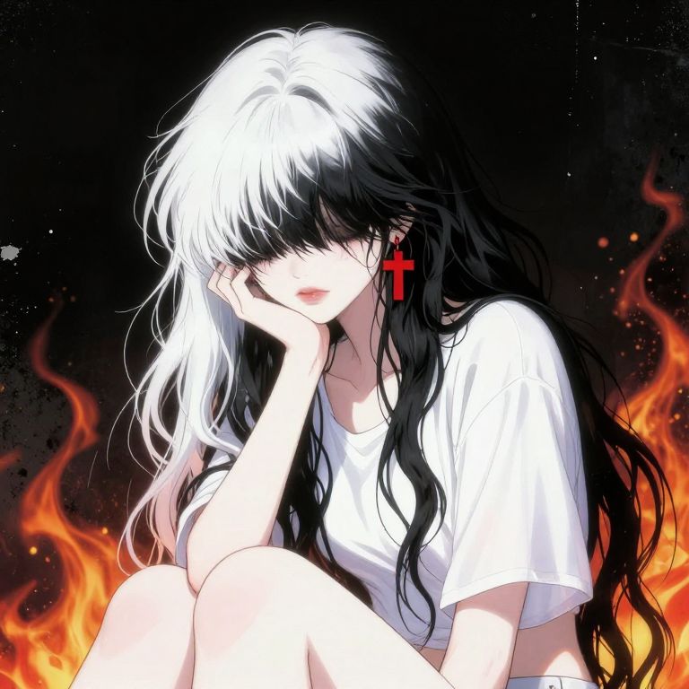 Anime-style digital artwork: Long black and white hair girl with red cross earring, white shirt, head resting on hand, surrounded by fiery flames against