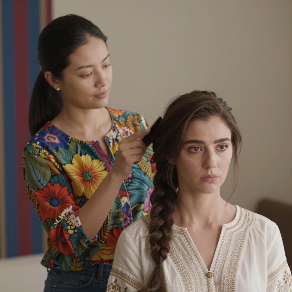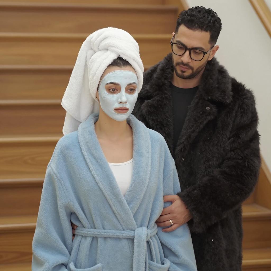 Two people. A woman with a white towel turban and face mask, wearing a light blue robe, stands in front. A man with glasses and a dark fur coat stands behind her, holding her arm. They are in front of wooden stairs. The woman's face is partially visible under the mask, with a neutral expression. The man's expression is focused. The woman's robe is slightly open, revealing a white shirt underneath. The man's hand is on her left arm.