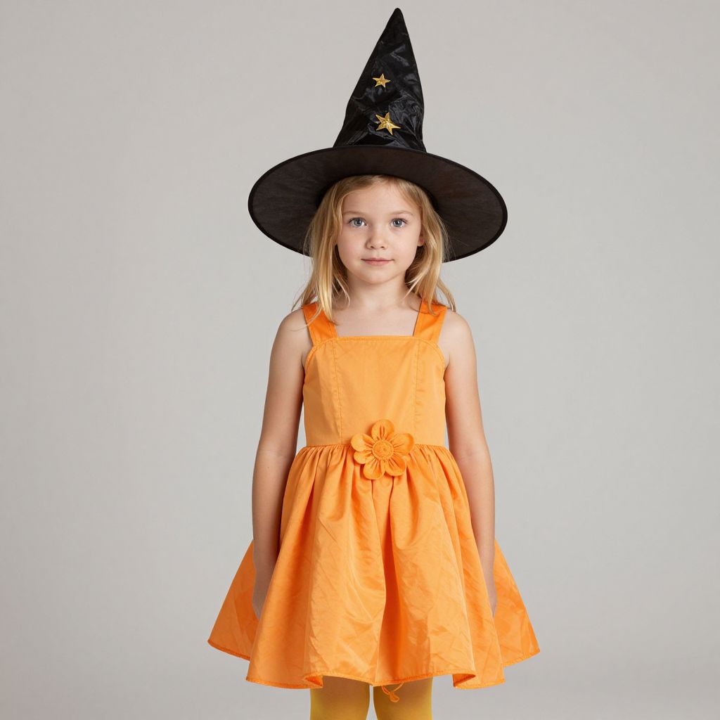 Star witch costume toddler, hat, witch hat, 1girl, blonde hair, looking at viewer, orange dress, flower, child, pantyhose