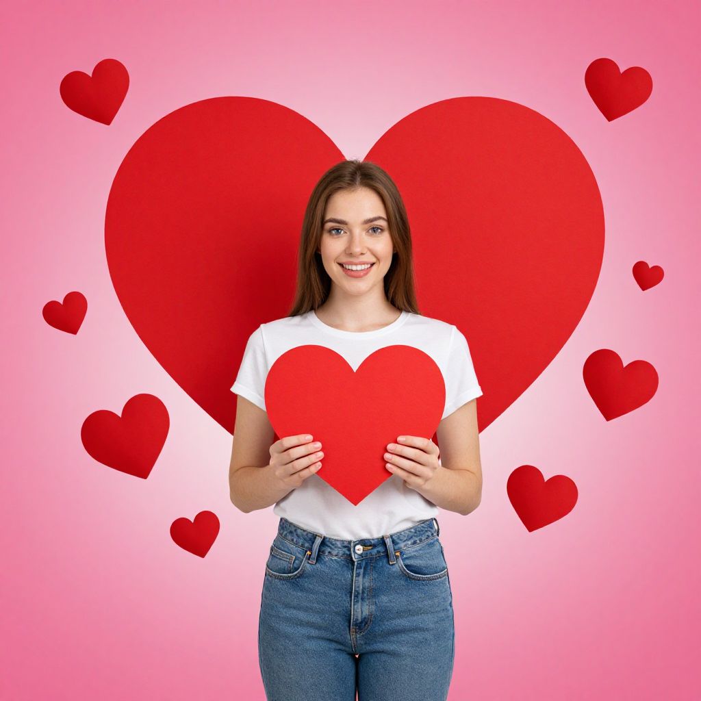Woman holding a red heart stands against a vibrant background featuring a large red heart and scattered smaller hearts, symbolizing love and affection.