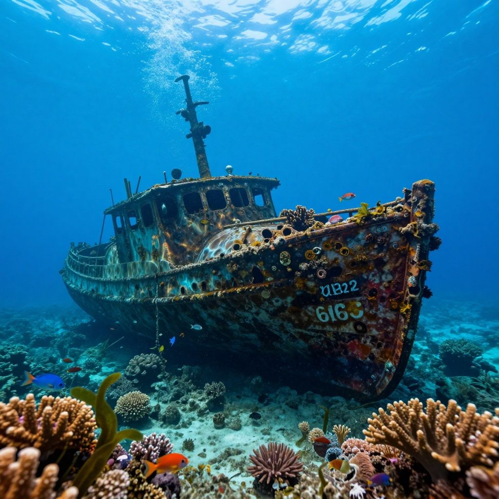 Intricately detailed beautiful under water scenery realistic photo, breath taking, colorful corals, fish school, ruins vestige of modern civilisation, (sunken boat:0.82), (underwater caustics:1.36), (algae, seaweed:0.46)