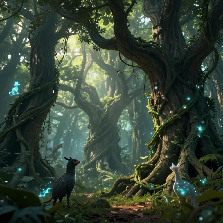 Beautiful fantasy forest filled with glowing magical plants and creatures, soft mist hovering above the ground, towering ancient trees with twisted branches, colorful flowers scattered around, ambient light beams breaking through the canopy, enchanting and mysterious mood.