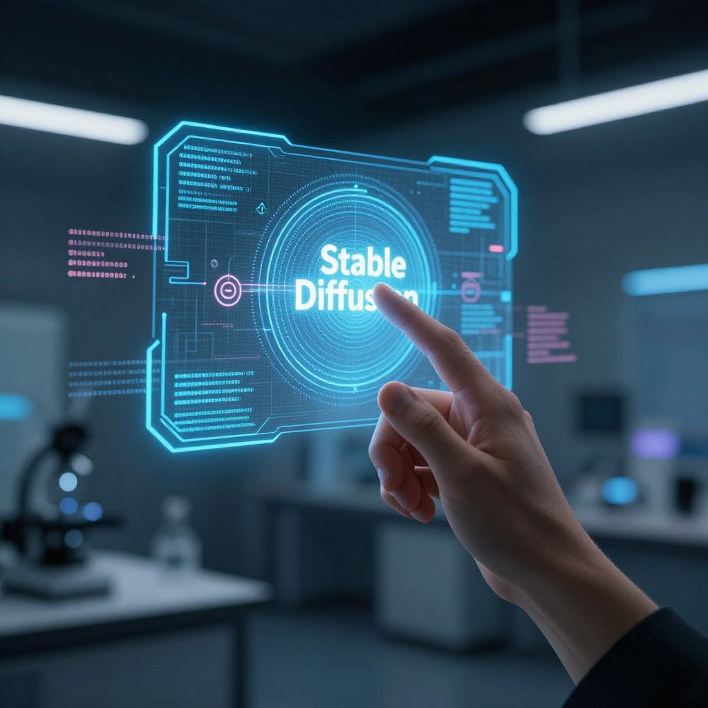 Photograph of a hand pointing at a glowing blue holographic "Stable Diffusion" interface in a futuristic lab with blurred equipment.