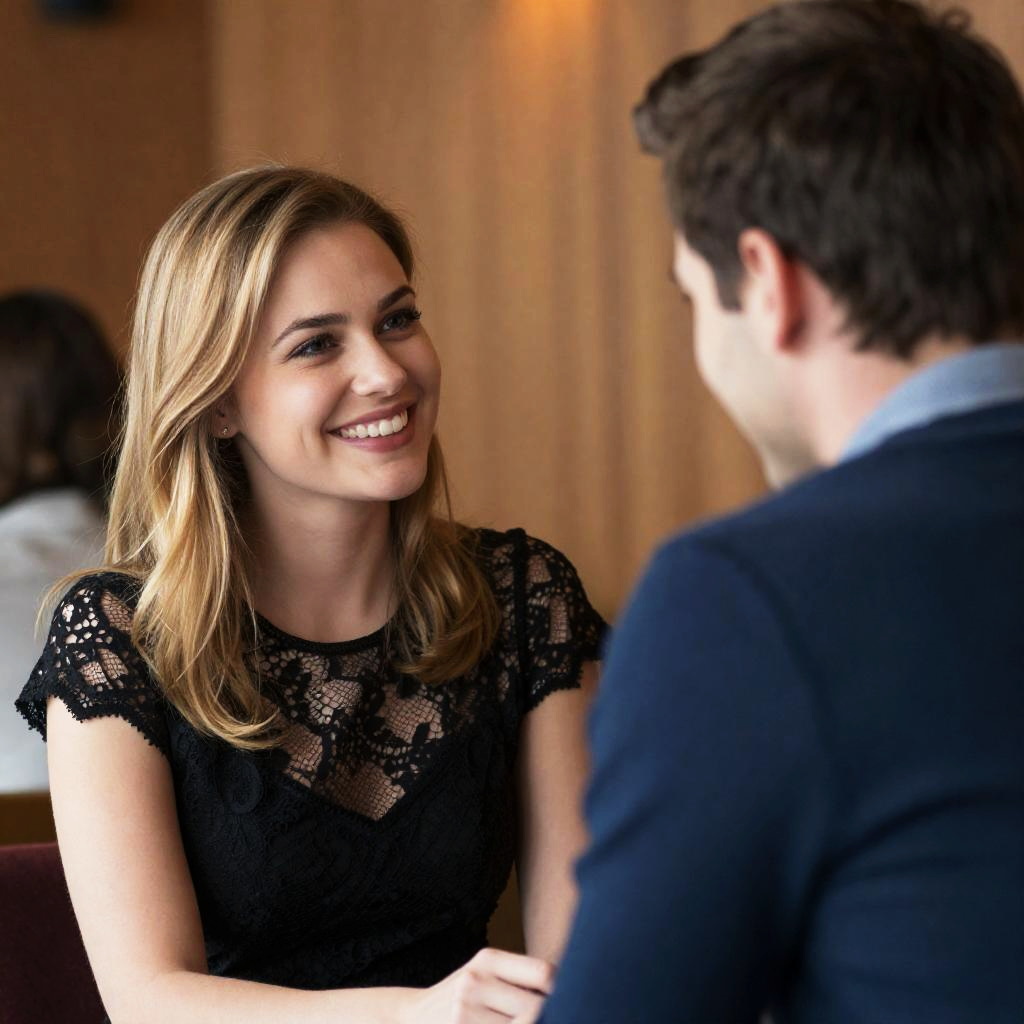 Photograph of two people in an office. Blonde woman with tied-back hair, white lace blouse, black skirt, smiling, standing. Man with dark hair, brown coat, blue and red scarf, hands raised, looking up at her. Brightly lit office background.