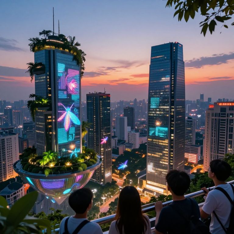 Visualize an otherworldly digital cityscape at twilight, where skyscrapers intermingle with flourishing greenery in a harmonious fusion of urban and natural elements. From an elevated vantage point, the viewer takes in the mesmerizing panorama from a hovering platform embellished with luminescent holographic screens that mirror the sunset's hues. As daylight recedes into dusk, luminous insects materialize from the darkness, their glistening wings projecting prismatic patterns on the city's glass surfaces and casting enchanting light upon the faces of captivated observers below, instilling a sense of awe and serenity within this magical urban oasis.