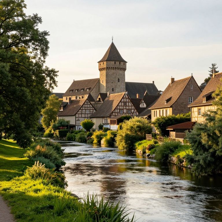 Photograph of a picturesque European village at sunset. Centered is a tall, stone, towered building with a pointed roof, surrounded by half-timbered houses with steep, dark roofs. A gentle, winding river runs through the foreground, reflecting the golden sunlight. Lush green trees and shrubs line the riverbank, with a grassy path on the left. The houses have beige and brown exteriors, and the scene is bathed in warm, late-day light, casting long shadows. The sky is clear with a soft gradient from blue to yellow.