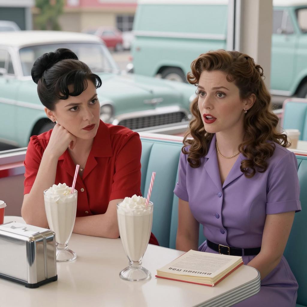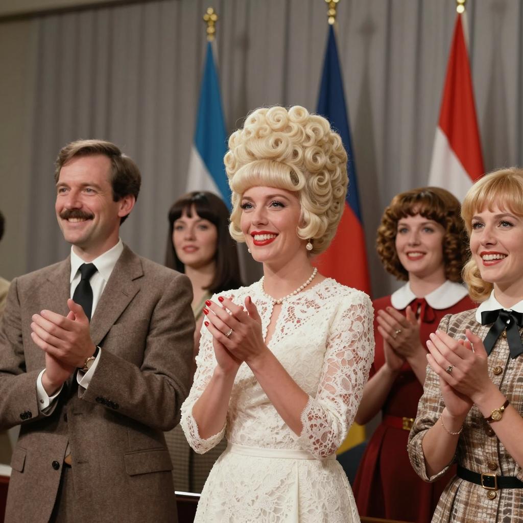 Woman with curly black hair and black dress, arms outstretched, standing on pool table wearing green tights. Crowded room, people in 1970s clothing, green lamps overhead. Red-haired woman in blue dress in foreground. Several men and women around, some laughing, others looking at her. Painting on wall in background.