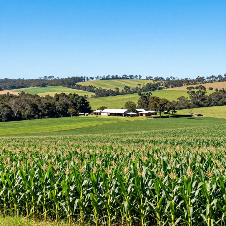Lush green fields stretch beneath a clear blue sky, dotted with vibrant corn plants in the foreground, while a serene farmstead sits nestled among dense trees and rolling hills, offering a picturesque 5.8-acre property just 5km from Murwillumbah. #NSW #FarmProperty #RealEstate #Farmland #RuralLiving