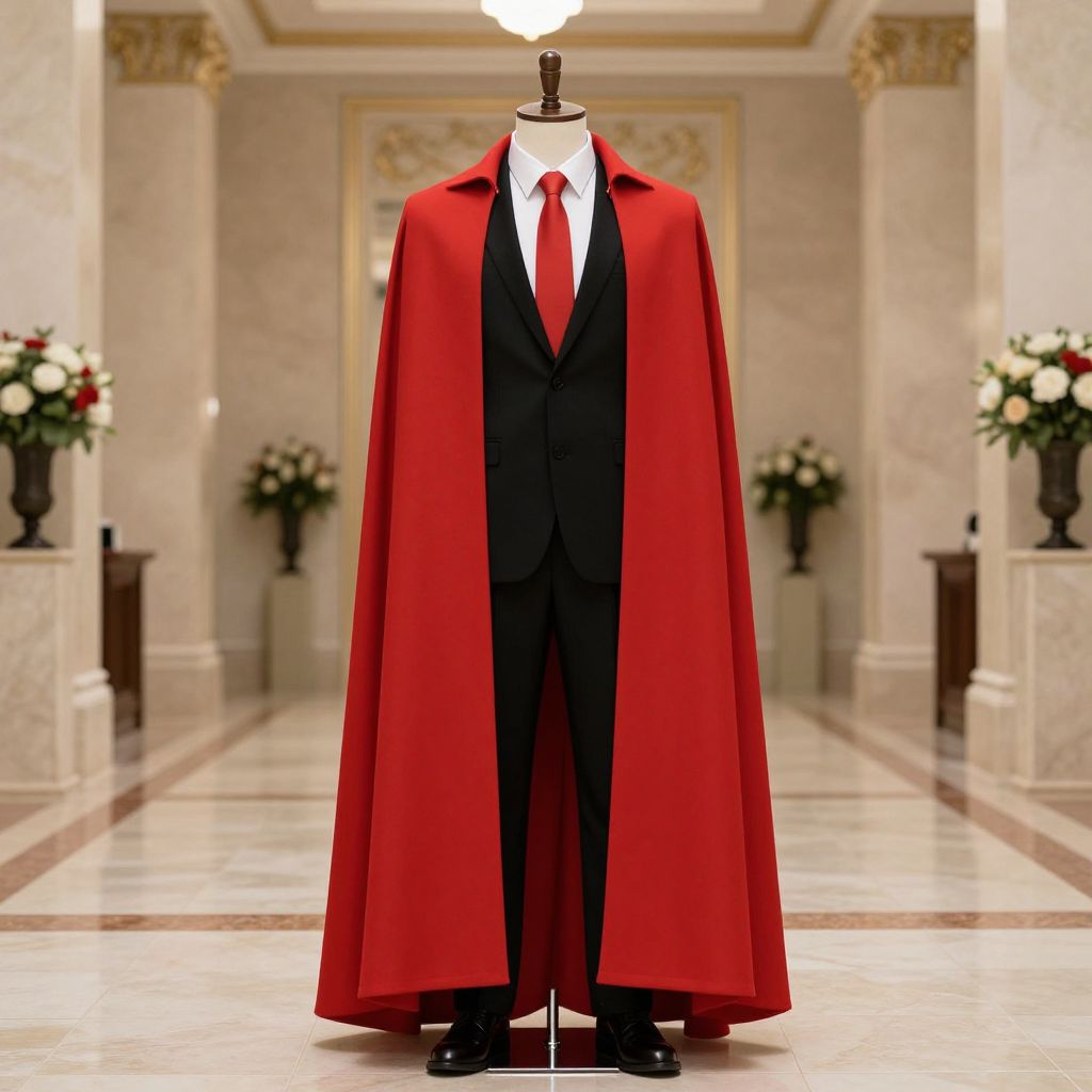 Outfit Funeral Costume, man in a red cape and black suit standing in a hall