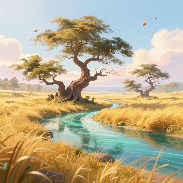 A fantasy landscape of windys, giant towering windswept trees with twisted branches, golden fields bending under persistent breeze, clear turquoise river reflecting the motion, mystical drifting seeds floating in the air, soft pastel colors with radiant lighting