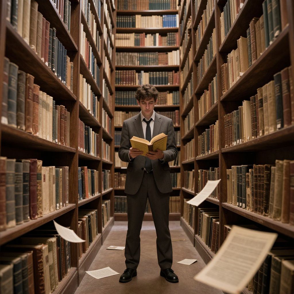 Photograph of a young man with wavy brown hair standing in a narrow library aisle. He wears a dark gray suit with a white shirt and black tie, holding a yellow book. Tall, wooden bookshelves filled with variously colored, leather-bound books line both sides of the aisle. Papers are scattered on the floor, some floating in the air. The lighting is warm, highlighting the rich textures of the books and shelves. The man is centered, looking down at his book, creating a sense of quiet focus amidst the chaos of floating papers. The background reveals more bookshelves disappearing into the distance.