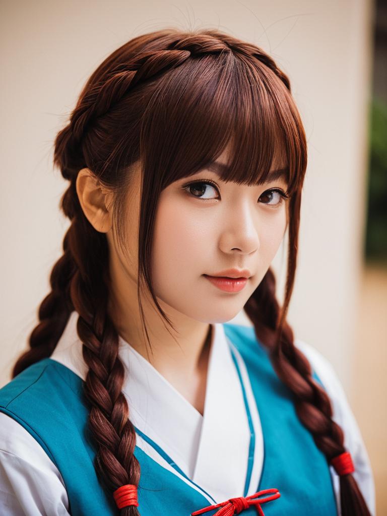 Photo-realistic cosplay photo of person in aoba kokona costume. 1girl, red eyes, brown hair, long hair, braided bangs, haircliplifestyle stock photo, shallow depth of field, lifestyle stock photography, shallow depth of field, natural lighting, warm tones, soft background blur, candid moments, vibrant colors, realistic textures, modern casual clothing. full body shot