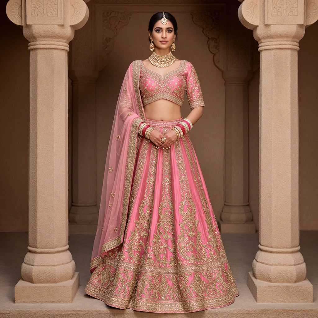 Photograph of an Indian woman standing in an ornate, beige stone archway. She wears a pink and gold traditional lehenga choli set with intricate embroidery and a semi-transparent pink dupatta draped over her shoulders. Her midriff is exposed, and she has a bindi on her forehead. She has dark hair styled in a neat bun with a hair accessory. She wears gold jewelry, including a necklace, earrings, and bangles. The background features detailed stone carvings. The lighting highlights her outfit's textures and the archway's architectural details. The overall style is elegant and traditional.