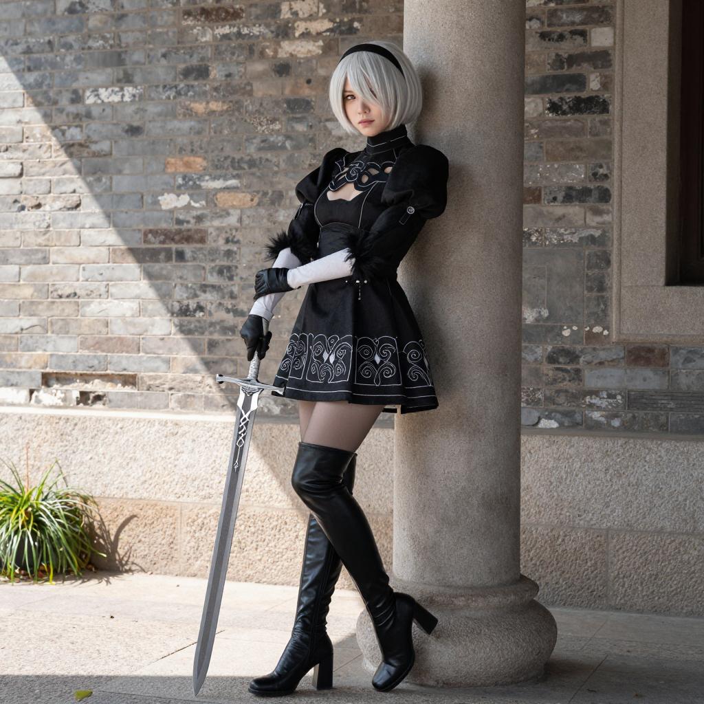 Female cosplayer in dark, gothic-style outfit with white bob haircut and black headband. Wearing black dress with gold embroidery, white gloves, thigh-high boots, and holding katana. Stands in ruins with broken metal beams, debris, and light filtering in. Wide-legged stance, intense gaze, and firm grip on katana. Full-body shot, central figure, blurred background. Realistic photograph.