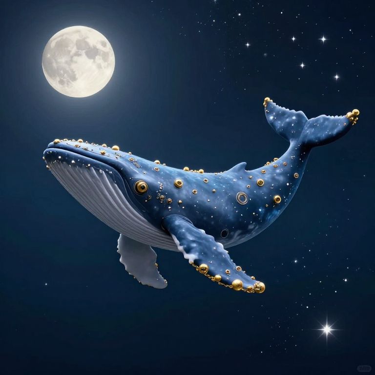 Whimsical whale glides gracefully through a starlit sea, its body adorned with golden bubbles and mechanical details, as it swims beneath a radiant moon and twinkling stars.