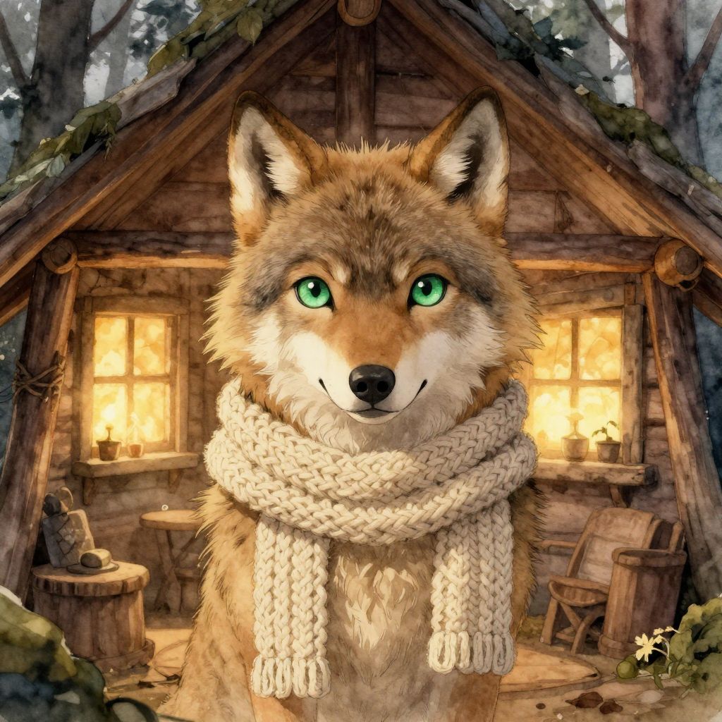 Digital painting of a cute, anthropomorphic wolf with green eyes, wearing a thick white scarf, standing in front of a warm, wooden cottage in a