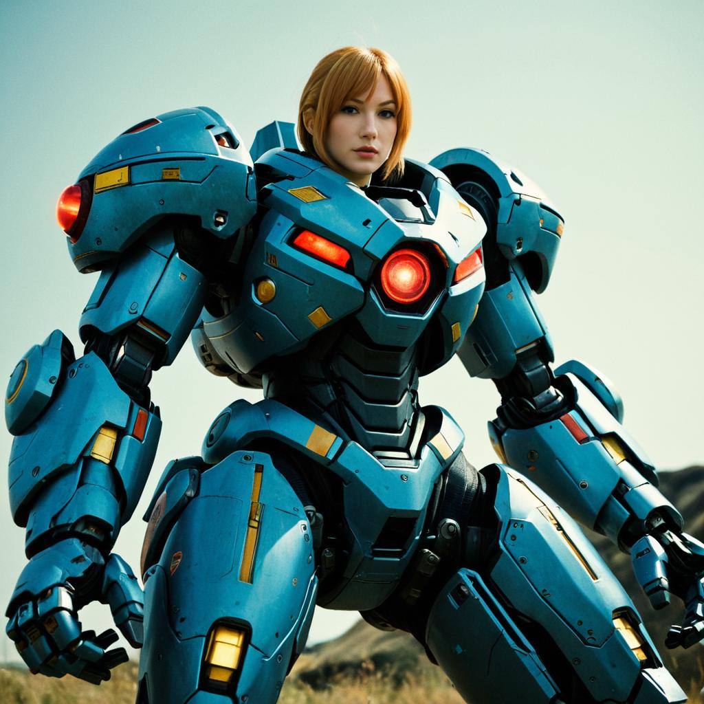 A young woman with short red hair encased in a large, futuristic blue mech suit featuring glowing red and yellow lights, standing outdoors against a clear sky. The advanced robotic armor has a mechanical, sci-fi design with detailed plating and articulations, emphasizing strength and technology.