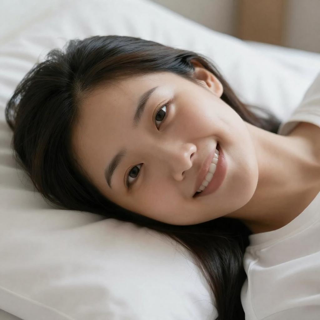Smiling Woman Lying on White Pillow