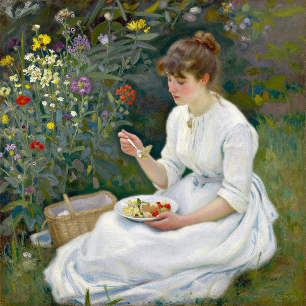This is a digital painting in a impressionistic style, depicting a young woman with fair skin and brown hair in a bun, wearing a white, long-sleeved, button-up dress. She sits on grass, surrounded by a vibrant garden with various colorful flowers, including red, yellow, and purple blooms. She holds a spoon to her mouth, eating from a plate of food, which includes fruits and possibly a pastry. A small, woven basket rests beside her on the grass. The background features a dark, shadowy area contrasting with the bright flowers and her white dress. The painting uses bold, expressive brushstrokes and a vivid color palette.